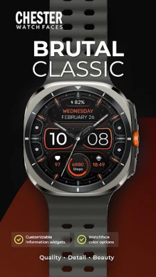 Chester Brutal Classic adalah tampilan jam hybrid untuk Wear OS, memadukan desain klasik dengan fungsionalitas modern. Dibuat bagi pengguna yang menghargai presisi, informasi esensial, dan personalisasi unik langsung di pergelangan tangan.