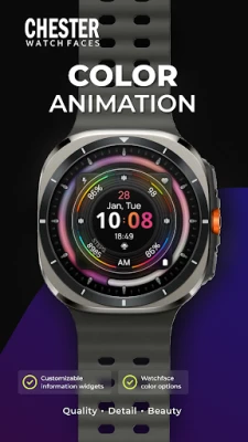 Chester Color Animation adalah tampilan jam Wear OS modern dengan animasi warna-warni, gaya, dan kustomisasi mendalam. Nikmati visual dinamis, transisi halus, dan pengalaman interaktif yang memadukan animasi dengan kepraktisan fungsional.