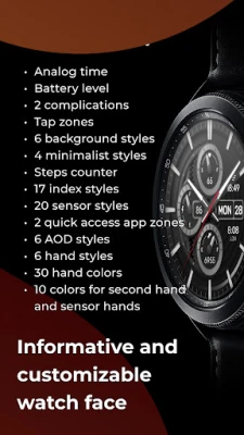 Selami dunia penyesuaian yang luas dengan Chester Hybrid. Aplikasi ini menawarkan berbagai pilihan untuk membentuk tampilan jam tangan Anda: mulai dari 6 gaya latar belakang dan 4 gaya minimalis yang menawan, hingga 6 gaya jarum jam dengan 30 pilihan warna, 10 warna jarum detik/sensor, 17 gaya indeks, dan 20 gaya sensor yang dinamis. Fungsionalitas cerdas juga terintegrasi apik dengan 2 komplikasi yang dapat disesuaikan, 2 zona aplikasi akses cepat, indikator level baterai, dan penghitung langkah. Seluruhnya didukung oleh zona ketuk interaktif serta 6 gaya Always-On Display (AOD) yang memastikan informasi selalu terlihat jelas dengan efisiensi daya.