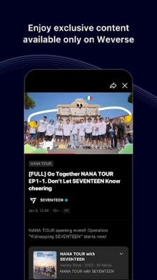 Selami dunia para idola favorit Anda dan rasakan kedekatan yang belum pernah ada sebelumnya. Di Weverse, Anda dapat menyaksikan kehidupan sehari-hari artis, melihat postingan terbaru, dan berinteraksi langsung melalui komentar dan suka. Hilangkan batasan geografis dan bahasa dengan fitur terjemahan otomatis canggih yang memungkinkan Anda memahami setiap postingan dan komentar, menghubungkan Anda dengan komunitas penggemar global secara mulus.
